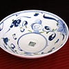 手作り(ロクロ成型)の歪な動きのあるフォルムに、大胆なタッチで描かれた藍ベースの万歴柄が小粋でオシャレにマッチした鉢です。