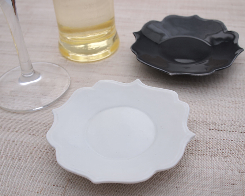 小物の器がお得意の美宣窯さんから和食器らしい桔梗渕の粋な小皿をセレクトしました。白・黒モノトーンの2色でご用意しました。