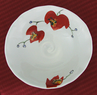 ▲ 真上から見るとちょっと楕円の形をしています。 渕にはわずかにフリルを加え、見込みには渦彫が施してあります。 可愛い形状に鮮やかな赤がオシャレに映えますね。