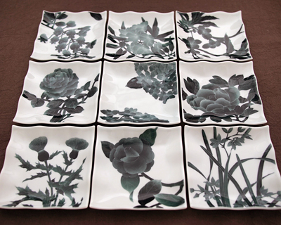 ← 花の形や構図の異なる絵柄で、それぞれに個性を感じさせるお皿は、並べても奇麗です。