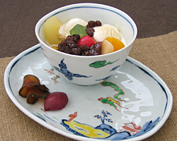 色が加わるだけで、渋い染付の器が華やかに生まれ変わりますね。