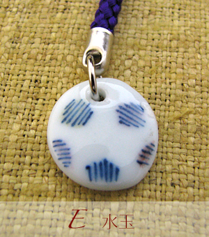 この中では一番小さい、ほんのり丸形のストラップ。染付の線書きで水玉模様を描き、釉彩で淡く色を乗せて可愛いく仕上げています。