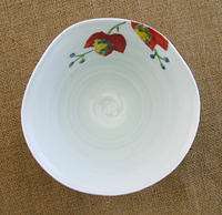 華やかな錦の器が特徴で人気の 『泰山窯』 さん♪ でも、最近になってこの華やかな錦も大変なピンチを迎えました。 それは錦の絵の具の『鉛毒』の問題です。 色絵の絵の具の発色を良くするために使われる『鉛』の使用の規制が厳しくなる影響で、『泰山窯』の錦も『無鉛絵具』の使用を余儀なくされ、その影響で今まで鮮やかに映えていた錦の色もちょっとおとなしめの色になってしまい、 『泰山窯』 の魅力も半減する結果となってしまいました。 そんな状況の中でこの「山ブドウ」の絵は赤の発色も鮮やかで、 『泰山窯』 の魅力を充分に感じられる作品だと思います。